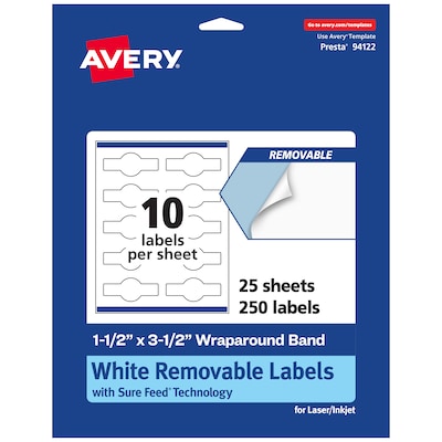 Add an elegant touch to home organization labels, price labels, soap labels, cosmetic product labels, jar labels, product seals, bottle labels and more with Avery 1.5" x 3.5" Matte White Removable Wraparound Band Labels. Made with matte white paper and removable adhesive, the removable Avery labels stick and stay but remove cleanly. Apply these removable white labels to smooth surfaces such as paper, plastic, cardboard, glass, or metal and peel them away without leaving behind messy residue. Avery wraparound band labels are carefully constructed with patented features to provide the best results. Sure Feed technology reduces jams or smudges by creating a more reliable feed through your printer. The print-to-the-edge layout lets you print beautiful full-bleed designs that fill each blank sticker to the edge. The dual-compatible printable labels are compatible with both laser printers and inkjet printers. Easily customize labels with your own designs, art, symbols, and messaging in Avery Design & Print. Whether you’re looking for labels to help organize your home, labels for a school project or product labels that will grab people’s attention, Avery Matte White Removable Labels are the perfect choice for any project.