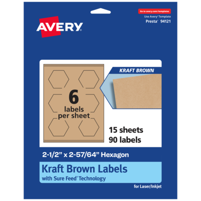 Easily add a rustic finish to crafts, gifts and products with Avery 2-1/2" x 2-57/64" Kraft Brown Hexagon Labels. Made with a kraft brown paper material that’s smooth to the touch, Avery kraft brown labels add a natural and handcrafted look to any project. This charming kraft brown material is perfect for adding a little homespun flair to cosmetic labels, soap labels, perfume labels, jar labels, candle labels, jewelry labels, mailing labels and more. Avery hexagon labels are carefully constructed and developed with patented features to provide the best results for every project. Sure Feed technology prevents jams or smudges by creating a more reliable feed through your printer. The print-to-the-edge layout lets you print beautiful full-bleed designs that fill each blank sticker to the edge. The strong permanent label adhesive makes sure that your labels stick and stay to a variety of surfaces without peeling, curling or falling off. Easily customize labels with your own designs, art, symbols and messaging by using the label templates and designs on the Avery website. The intuitive tools make it easy to add your personal touch to any project.
