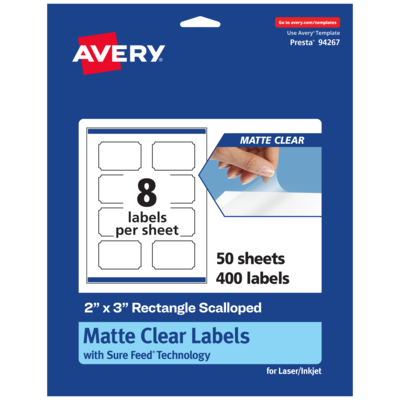 Create a seamless look with Avery Matte Clear Labels with a frosted, translucent finish that blends perfectly with light-colored or textured surfaces. Create frosted clear product labels, soap labels, candle labels, perfume labels, wedding and party favor labels, food & beverage labels, thank you labels, and more with Avery 2" x 3" Matte Clear Rectangle Scalloped Labels. The soft, translucent material of Avery Clear Labels is perfect for creating clear labels that blend seamlessly into lighter-colored objects and surfaces. The slightly frosted appearance also helps provide contrast to make sure your print stays legible. Avery rectangle scalloped labels are carefully constructed with patented features to provide the best results. Sure Feed technology reduces jams and smudges by creating a more reliable feed through your printer. The print-to-the-edge layout lets you print beautiful full-bleed designs that fill each blank sticker to the edge. The strong permanent label adhesive makes sure that your labels stick and stay to a variety of surfaces without peeling, curling or falling off. Easily customize labels with your own designs, art, symbols, and messaging by using the label templates and designs on the Avery website.