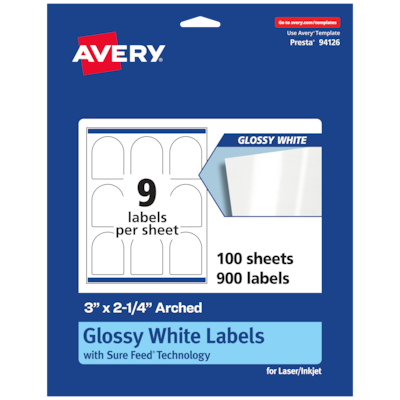 Add a beautiful shine to bottle labels, candle labels, beer bottle labels, jar labels, party favor labels and more with Avery 3" x 2.25" Glossy White Arched Labels. The glossy finish gives labels a remarkable shine and helps give the colors of your design a little extra pop. Avery arched labels are carefully constructed with patented features to provide the best results. Sure Feed technology reduces jams or smudges by creating a more reliable feed through your printer. The print-to-the-edge layout lets you print beautiful full-bleed designs that fill each blank sticker to the edge. The strong permanent label adhesive makes sure that your labels stick and stay to a variety of surfaces without peeling, curling or falling off. Easily customize labels with your own designs, art, symbols and messaging by using the label templates and designs on the Avery website.