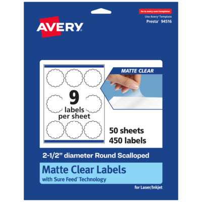 Create frosted clear product labels, soap labels, ingredient labels, candle labels, jar labels, perfume labels, wedding and party favor labels, thank you labels, and more with Avery 2-1/2" Diameter Matte Clear Round Scalloped Labels. The soft, translucent material of Avery Clear Labels is perfect for creating clear labels that blend seamlessly into lighter-colored objects and surfaces. The slightly frosted appearance also helps provide contrast to make sure your print stays legible. Avery round scalloped labels are carefully constructed with patented features to provide the best results. Sure Feed technology reduces jams and smudges by creating a more reliable feed through your printer. The print-to-the-edge layout lets you print beautiful full-bleed designs that fill each blank sticker to the edge. The strong permanent label adhesive makes sure that your labels stick and stay to a variety of surfaces without peeling, curling or falling off. Easily customize labels with your own designs, art, symbols, and messaging by using the label templates and designs on the Avery website.