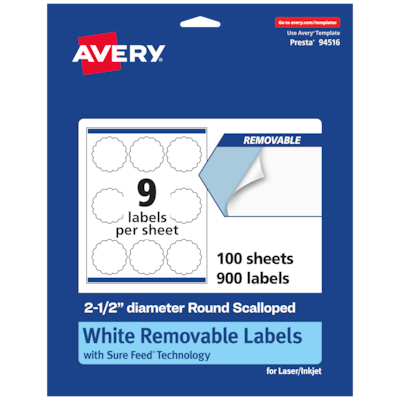 Add an elegant touch to home organization labels, price labels, mailing seals, candle labels, pricing labels, soap labels, product labels, round spice labels, mason jar labels and more with Avery 2.5" diameter Matte White Removable Round Scalloped Labels. Made with matte white paper and removable adhesive, the removable Avery labels stick and stay but remove cleanly. Apply these removable white labels to smooth surfaces such as paper, plastic, cardboard, glass, or metal and peel them away without leaving behind messy residue. Avery round scalloped labels are carefully constructed with patented features to provide the best results. Sure Feed technology reduces jams or smudges by creating a more reliable feed through your printer. The print-to-the-edge layout lets you print beautiful full-bleed designs that fill each blank sticker to the edge. The dual-compatible printable labels are compatible with both laser printers and inkjet printers. Easily customize labels with your own designs, art, symbols, and messaging in Avery Design & Print. Whether you’re looking for labels to help organize your home, labels for a school project or product labels that will grab people’s attention, Avery Matte White Removable Labels are the perfect choice for any project.