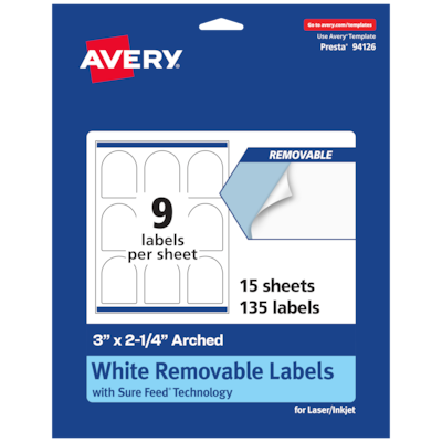 Enjoy flexible labeling solutions with Avery Matte White Removable Paper Labels. Add an elegant touch to home organization labels, price labels, candle labels, beer bottle labels, jar labels and more with Avery 3" x 2.25" Matte White Removable Arched Labels. Made with matte white paper and removable adhesive, the removable Avery labels stick and stay but remove cleanly. Apply these removable white labels to smooth surfaces such as paper, plastic, cardboard, glass, or metal and peel them away without leaving behind messy residue. Avery arched labels are carefully constructed with patented features to provide the best results. Sure Feed technology reduces jams or smudges by creating a more reliable feed through your printer. The print-to-the-edge layout lets you print beautiful full-bleed designs that fill each blank sticker to the edge. The dual-compatible printable labels are compatible with both laser printers and inkjet printers. Easily customize labels with your own designs, art, symbols, and messaging in Avery Design & Print. Whether you’re looking for labels to help organize your home, labels for a school project or product labels that will grab people’s attention, Avery Matte White Removable Labels are the perfect choice for any project.