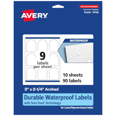 Personalize bottle labels, candle labels, jar labels and more with Avery 3" x 2.25" Durable Waterproof Arched Film Labels. Designed to withstand harsh conditions, Avery durable waterproof labels can be completely submerged in water without falling apart. They are also resistant to damage from heat, cold, oil and tearing and are also safe to wipe with household cleaners. Avery arched labels are carefully constructed with patented features to provide the best results. Sure Feed technology reduces jams or smudges by creating a more reliable feed through your printer. The print-to-the-edge layout lets you print beautiful full-bleed designs that fill each blank sticker to the edge. The strong permanent label adhesive makes sure that your labels stick and stay to a variety of surfaces without peeling, curling or falling off. Easily customize labels with your own designs, art, symbols and messaging by using the label templates and designs on the Avery website. *Please Note: Avery durable waterproof labels are compatible with laser printers and pigment-based inkjet printers but are not compatible with traditional dye-based inkjet printers. Ink from dye-based inkjet printers will smear when exposed to water. Please check your printer's manual to confirm if you are using pigment-based ink.