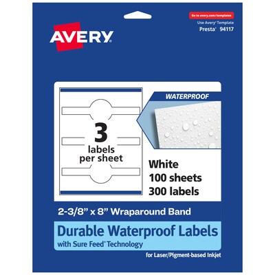 Personalize durable and waterproof soap labels, cosmetic product labels, jar labels, product seals, bottle labels and more with Avery 2-3/8" x 8" Durable Waterproof Wraparound Film Labels. Designed to withstand harsh conditions, Avery durable waterproof labels can be completely submerged in water without falling apart. They are also resistant to damage from heat, cold, oil and tearing and are also safe to wipe with household cleaners. Avery wraparound band labels are carefully constructed with patented features to provide the best results Sure Feed technology prevents jams or smudges by creating a more reliable feed through your printer. These waterproof labels are compatible with both laser and pigment-based inkjet printers* so that you can effortlessly print bold, bright colors and clear, sharp text. The sturdy permanent label adhesive makes sure that your labels stick and stay to a variety of surfaces without peeling, curling or falling off. Easily customize labels with your own designs, art, symbols and messaging by using the label templates and designs on the Avery website. *Please Note: Avery durable waterproof labels are compatible with laser printers and pigment-based inkjet printers but are not compatible with traditional dye-based inkjet printers. Ink from dye-based inkjet printers will smear when exposed to water. Please check your printer's manual to confirm if you are using pigment-based ink.