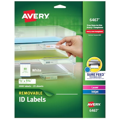 Avery Sure Feed Laser/Inkjet ID Labels, 1/2" x 1-3/4", White, 2,000 Labels/Pack (6467)