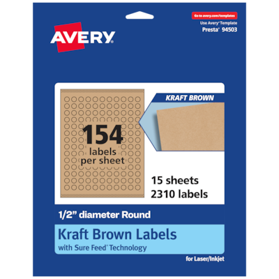 Easily add a rustic finish to crafts, gifts and products with Avery .5" diameter Kraft Brown Round Labels. Made with a kraft brown paper material that’s smooth to the touch, Avery kraft brown labels add a natural and handcrafted look to any project. This charming kraft brown material is perfect for adding a little homespun flair to mailing seals, candle labels, pricing labels, soap labels, product labels, round spice labels, mason jar labels and more. Avery round labels are carefully constructed and developed with patented features to provide the best results for every project. Sure Feed technology prevents jams or smudges by creating a more reliable feed through your printer. The print-to-the-edge layout lets you print beautiful full-bleed designs that fill each blank sticker to the edge. The patented Easy Peel label design makes these labels easy to peel and quick to apply. Just bend the label sheet, peel off your labels and fold the sheet back flat. The strong permanent label adhesive makes sure that your labels stick and stay to a variety of surfaces without peeling, curling or falling off. Easily customize labels with your own designs, art, symbols and messaging by using the label templates and designs on the Avery website. The intuitive tools make it easy to add your personal touch to any project.
