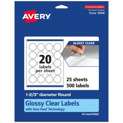 Create mailing seals, candle labels, pricing labels, soap labels, product labels, round spice labels, mason jar labels that are absolutely clear with Avery 1-2/3" diameter Glossy Clear round Labels. Clear as glass with a reflective shine, Avery glossy clear labels vanish when applied to glass and metal surfaces. The transparent and glossy label material is also perfect for making the colors in your design pop and look even more vibrant on lighter surfaces. Avery round labels are carefully constructed and developed with patented features to provide the best results for every project. Sure Feed technology prevents jams or smudges by creating a more reliable feed through your printer. The print-to-the-edge layout lets you print beautiful full-bleed designs that fill each blank sticker to the edge. The patented Easy Peel label design makes these labels easy to peel and quick to apply. Just bend the label sheet, peel off your labels and fold the sheet back flat. The strong permanent label adhesive makes sure that your labels stick and stay to a variety of surfaces without peeling, curling or falling off. Easily customize labels with your own designs, art, symbols and messaging by using the label templates and designs on the Avery website. The intuitive tools make it easy to add your personal touch to any project.