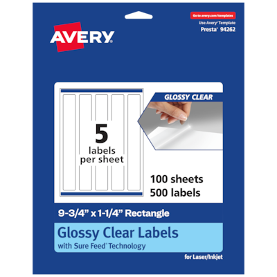 Create mailing labels, product labels, labels for food containers, soap labels, candle jar labels, tamper-evident seals that are absolutely clear with Avery 9.75" x 1.25" Glossy Clear rectangle Labels. Clear as glass with a reflective shine, Avery glossy clear labels vanish when applied to glass and metal surfaces. The transparent and glossy label material is also perfect for making the colors in your design pop and look even more vibrant on lighter surfaces. Avery rectangle labels are carefully constructed and developed with patented features to provide the best results for every project. Sure Feed technology prevents jams or smudges by creating a more reliable feed through your printer. The print-to-the-edge layout lets you print beautiful full-bleed designs that fill each blank sticker to the edge. The strong permanent label adhesive makes sure that your labels stick and stay to a variety of surfaces without peeling, curling or falling off. Easily customize labels with your own designs, art, symbols and messaging by using the label templates and designs on the Avery website. The intuitive tools make it easy to add your personal touch to any project.