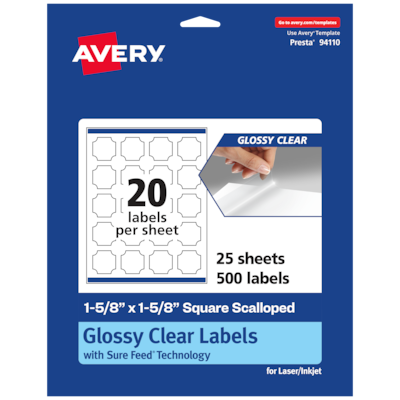 Achieve a flawless, crystal-clear finish with Avery Glossy Clear labels that vanish on application for a premium, printed-on look. Create candle labels, mason jar labels, pricing labels, soap labels, product labels, canning labels, ingredient labels that are absolutely clear with Avery 1-5/8" x 1-5/8" Glossy Clear square scalloped Labels. Clear as glass with a reflective shine, Avery glossy clear labels vanish when applied to glass and metal surfaces. The transparent and glossy label material is also perfect for making the colors in your design pop and look even more vibrant on lighter surfaces. Avery square scalloped labels are carefully constructed and developed with patented features to provide the best results for every project. Sure Feed technology prevents jams or smudges by creating a more reliable feed through your printer. The print-to-the-edge layout lets you print beautiful full-bleed designs that fill each blank sticker to the edge. The strong permanent label adhesive makes sure that your labels stick and stay to a variety of surfaces without peeling, curling or falling off. Easily customize labels with your own designs, art, symbols and messaging by using the label templates and designs on the Avery website. The intuitive tools make it easy to add your personal touch to any project.
