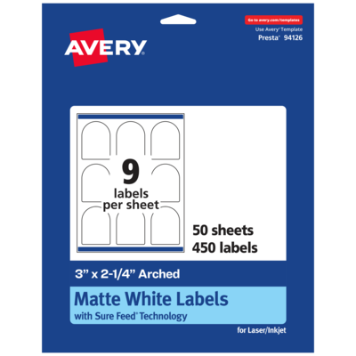 Avery Matte White Labels have a smooth finish in a variety of sizes. Easily create bottle labels, candle labels, beer bottle labels, jar labels, party favor labels and more with Avery 3" x 2.25" Matte White Arched Labels. Perfect for any project, the smooth white paper material is always a great choice whether you need to make labels at home or for work. Avery arched labels are carefully constructed with patented features to provide the best results. Sure Feed technology reduces jams or smudges by creating a more reliable feed through your printer. The print-to-the-edge layout lets you print beautiful full-bleed designs that fill each blank sticker to the edge. The strong permanent label adhesive makes sure that your labels stick and stay to a variety of surfaces without peeling, curling or falling off. Easily customize labels with your own designs, art, symbols and messaging by using the label templates and designs on the Avery website.