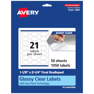 Achieve a flawless, crystal-clear finish with Avery Glossy Clear labels that vanish on application for a premium, printed-on look. Create wedding labels, food labels, beverage labels, mason jar labels, canning labels, ingredient labels that are absolutely clear with Avery 1-1/8" x 2-1/4" Glossy Clear oval scalloped Labels. Clear as glass with a reflective shine, Avery glossy clear labels vanish when applied to glass and metal surfaces. The transparent and glossy label material is also perfect for making the colors in your design pop and look even more vibrant on lighter surfaces. Avery oval scalloped labels are carefully constructed and developed with patented features to provide the best results for every project. Sure Feed technology prevents jams or smudges by creating a more reliable feed through your printer. The print-to-the-edge layout lets you print beautiful full-bleed designs that fill each blank sticker to the edge. The patented Easy Peel label design makes these labels easy to peel and quick to apply. Just bend the label sheet, peel off your labels and fold the sheet back flat. The strong permanent label adhesive makes sure that your labels stick and stay to a variety of surfaces without peeling, curling or falling off. Easily customize labels with your own designs, art, symbols and messaging by using the label templates and designs on the Avery website. The intuitive tools make it easy to add your personal touch to any project.