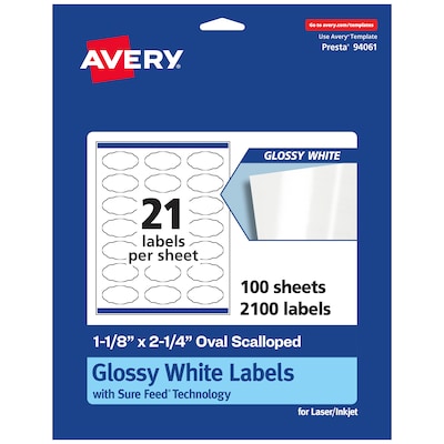 Add a beautiful shine to wedding labels, food labels, beverage labels, mason jar labels, canning labels, ingredient labels and more with Avery 1-1/8" x 2-1/4" Glossy White Oval Scalloped Labels. Avery oval scalloped labels are carefully constructed with patented features to provide the best results. Sure Feed technology prevents jams or smudges by creating a more reliable feed through your printer. The print-to-the-edge layout lets you print beautiful full-bleed designs that fill each blank sticker to the edge. These glossy white oval scalloped labels are compatible with both laser and inkjet printers so that you can effortlessly print bold, bright colors and clear, sharp text. The sturdy permanent label adhesive makes sure that your labels stick and stay to a variety of surfaces without peeling, curling or falling off. Easily customize labels with your own designs, art, symbols and messaging by using the free label templates and designs in Avery Design & Print. Whether you're creating product labels for a small business, custom labels for classrooms or professional labels for the office, Avery glossy white labels will add a brilliant and beautiful shine to any project.