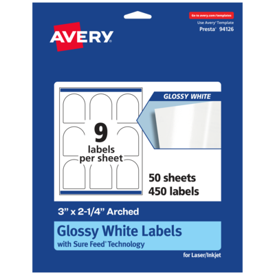 Add a beautiful shine to bottle labels, candle labels, beer bottle labels, jar labels, party favor labels and more with Avery 3" x 2.25" Glossy White Arched Labels. The glossy finish gives labels a remarkable shine and helps give the colors of your design a little extra pop. Avery arched labels are carefully constructed with patented features to provide the best results. Sure Feed technology reduces jams or smudges by creating a more reliable feed through your printer. The print-to-the-edge layout lets you print beautiful full-bleed designs that fill each blank sticker to the edge. The strong permanent label adhesive makes sure that your labels stick and stay to a variety of surfaces without peeling, curling or falling off. Easily customize labels with your own designs, art, symbols and messaging by using the label templates and designs on the Avery website.