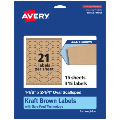 Easily add a rustic finish to crafts, gifts and products with Avery 1-1/8" x 2-1/4" Kraft Brown Oval Scalloped Labels. Made with a kraft brown paper material that’s smooth to the touch, Avery kraft brown labels add a natural and handcrafted look to any project. This charming kraft brown material is perfect for adding a little homespun flair to wedding labels, food labels, beverage labels, mason jar labels, canning labels, ingredient labels and more. Avery oval scalloped labels are carefully constructed and developed with patented features to provide the best results for every project. Sure Feed technology prevents jams or smudges by creating a more reliable feed through your printer. The print-to-the-edge layout lets you print beautiful full-bleed designs that fill each blank sticker to the edge. The patented Easy Peel label design makes these labels easy to peel and quick to apply. Just bend the label sheet, peel off your labels and fold the sheet back flat. The strong permanent label adhesive makes sure that your labels stick and stay to a variety of surfaces without peeling, curling or falling off. Easily customize labels with your own designs, art, symbols and messaging by using the label templates and designs on the Avery website. The intuitive tools make it easy to add your personal touch to any project.