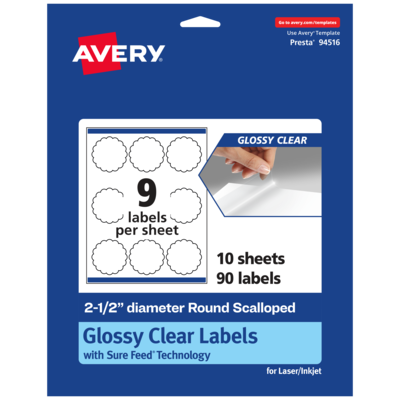 Create mailing seals, candle labels, pricing labels, soap labels, product labels, round spice labels, mason jar labels that are absolutely clear with Avery 2.5" diameter Glossy Clear round scalloped Labels. Clear as glass with a reflective shine, Avery glossy clear labels vanish when applied to glass and metal surfaces. The transparent and glossy label material is also perfect for making the colors in your design pop and look even more vibrant on lighter surfaces. Avery round scalloped labels are carefully constructed and developed with patented features to provide the best results for every project. Sure Feed technology prevents jams or smudges by creating a more reliable feed through your printer. The print-to-the-edge layout lets you print beautiful full-bleed designs that fill each blank sticker to the edge. The strong permanent label adhesive makes sure that your labels stick and stay to a variety of surfaces without peeling, curling or falling off. Easily customize labels with your own designs, art, symbols and messaging by using the label templates and designs on the Avery website. The intuitive tools make it easy to add your personal touch to any project.