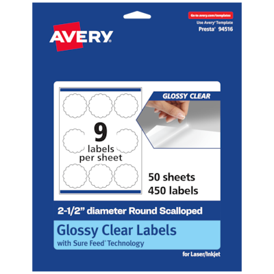 Create mailing seals, candle labels, pricing labels, soap labels, product labels, round spice labels, mason jar labels that are absolutely clear with Avery 2.5" diameter Glossy Clear round scalloped Labels. Clear as glass with a reflective shine, Avery glossy clear labels vanish when applied to glass and metal surfaces. The transparent and glossy label material is also perfect for making the colors in your design pop and look even more vibrant on lighter surfaces. Avery round scalloped labels are carefully constructed and developed with patented features to provide the best results for every project. Sure Feed technology prevents jams or smudges by creating a more reliable feed through your printer. The print-to-the-edge layout lets you print beautiful full-bleed designs that fill each blank sticker to the edge. The strong permanent label adhesive makes sure that your labels stick and stay to a variety of surfaces without peeling, curling or falling off. Easily customize labels with your own designs, art, symbols and messaging by using the label templates and designs on the Avery website. The intuitive tools make it easy to add your personal touch to any project.