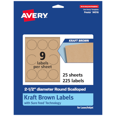 Easily add a rustic finish to crafts, gifts and products with Avery 2.5" diameter Kraft Brown Round Scalloped Labels. Made with a kraft brown paper material that’s smooth to the touch, Avery kraft brown labels add a natural and handcrafted look to any project. This charming kraft brown material is perfect for adding a little homespun flair to mailing seals, candle labels, pricing labels, soap labels, product labels, round spice labels, mason jar labels and more. Avery round scalloped labels are carefully constructed and developed with patented features to provide the best results for every project. Sure Feed technology prevents jams or smudges by creating a more reliable feed through your printer. The print-to-the-edge layout lets you print beautiful full-bleed designs that fill each blank sticker to the edge. The strong permanent label adhesive makes sure that your labels stick and stay to a variety of surfaces without peeling, curling or falling off. Easily customize labels with your own designs, art, symbols and messaging by using the label templates and designs on the Avery website. The intuitive tools make it easy to add your personal touch to any project.