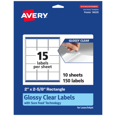 Avery Laser/Inkjet Multipurpose Labels, 2.625" x 2", Glossy Clear, 150/Pack (94235)