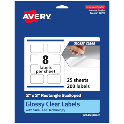 Achieve a flawless, crystal-clear finish with Avery Glossy Clear labels that vanish on application for a premium, printed-on look. Create mailing labels, product labels, labels for food containers, soap labels, candle jar labels, body scrub labels that are absolutely clear with Avery 2" x 3" Glossy Clear rectangle scalloped Labels. Clear as glass with a reflective shine, Avery glossy clear labels vanish when applied to glass and metal surfaces. The transparent and glossy label material is also perfect for making the colors in your design pop and look even more vibrant on lighter surfaces. Avery rectangle scalloped labels are carefully constructed and developed with patented features to provide the best results for every project. Sure Feed technology prevents jams or smudges by creating a more reliable feed through your printer. The print-to-the-edge layout lets you print beautiful full-bleed designs that fill each blank sticker to the edge. The strong permanent label adhesive makes sure that your labels stick and stay to a variety of surfaces without peeling, curling or falling off. Easily customize labels with your own designs, art, symbols and messaging by using the label templates and designs on the Avery website. The intuitive tools make it easy to add your personal touch to any project.