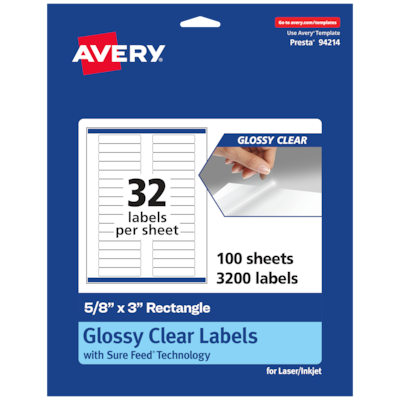 Create mailing labels, product labels, labels for food containers, soap labels, candle jar labels, body scrub labels that are absolutely clear with Avery 5/8" x 3" Glossy Clear rectangle Labels. Clear as glass with a reflective shine, Avery glossy clear labels vanish when applied to glass and metal surfaces. The transparent and glossy label material is also perfect for making the colors in your design pop and look even more vibrant on lighter surfaces. Avery rectangle labels are carefully constructed and developed with patented features to provide the best results for every project. Sure Feed technology prevents jams or smudges by creating a more reliable feed through your printer. The strong permanent label adhesive makes sure that your labels stick and stay to a variety of surfaces without peeling, curling or falling off. Easily customize labels with your own designs, art, symbols and messaging by using the label templates and designs on the Avery website. The intuitive tools make it easy to add your personal touch to any project.