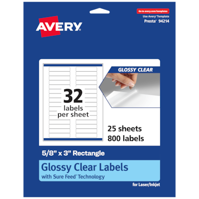Create mailing labels, product labels, labels for food containers, soap labels, candle jar labels, body scrub labels that are absolutely clear with Avery 5/8" x 3" Glossy Clear rectangle Labels. Clear as glass with a reflective shine, Avery glossy clear labels vanish when applied to glass and metal surfaces. The transparent and glossy label material is also perfect for making the colors in your design pop and look even more vibrant on lighter surfaces. Avery rectangle labels are carefully constructed and developed with patented features to provide the best results for every project. Sure Feed technology prevents jams or smudges by creating a more reliable feed through your printer. The strong permanent label adhesive makes sure that your labels stick and stay to a variety of surfaces without peeling, curling or falling off. Easily customize labels with your own designs, art, symbols and messaging by using the label templates and designs on the Avery website. The intuitive tools make it easy to add your personal touch to any project.