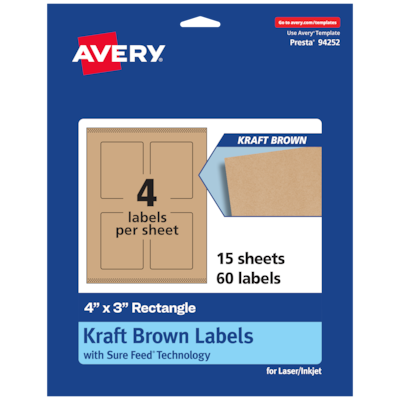 Easily add a rustic finish to crafts, gifts and products with Avery 4" x 3" Kraft Brown Rectangle Labels. Made with a kraft brown paper material that’s smooth to the touch, Avery kraft brown labels add a natural and handcrafted look to any project. This charming kraft brown material is perfect for adding a little homespun flair to decorative shipping labels, labels for storage bins, product labels, labels for food containers, large bottle labels and more. Avery rectangle labels are carefully constructed and developed with patented features to provide the best results for every project. Sure Feed technology prevents jams or smudges by creating a more reliable feed through your printer. The print-to-the-edge layout lets you print beautiful full-bleed designs that fill each blank sticker to the edge. The strong permanent label adhesive makes sure that your labels stick and stay to a variety of surfaces without peeling, curling or falling off. Easily customize labels with your own designs, art, symbols and messaging by using the label templates and designs on the Avery website. The intuitive tools make it easy to add your personal touch to any project.