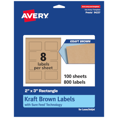 Easily add a rustic finish to crafts, gifts and products with Avery 2" x 3" Kraft Brown Rectangle Labels. Made with a kraft brown paper material that’s smooth to the touch, Avery kraft brown labels add a natural and handcrafted look to any project. This charming kraft brown material is perfect for adding a little homespun flair to mailing labels, product labels, labels for food containers, soap labels, candle jar labels, body scrub labels and more. Avery rectangle labels are carefully constructed and developed with patented features to provide the best results for every project. Sure Feed technology prevents jams or smudges by creating a more reliable feed through your printer. The print-to-the-edge layout lets you print beautiful full-bleed designs that fill each blank sticker to the edge. The patented Easy Peel label design makes these labels easy to peel and quick to apply. Just bend the label sheet, peel off your labels and fold the sheet back flat. The strong permanent label adhesive makes sure that your labels stick and stay to a variety of surfaces without peeling, curling or falling off. Easily customize labels with your own designs, art, symbols and messaging by using the label templates and designs on the Avery website. The intuitive tools make it easy to add your personal touch to any project.