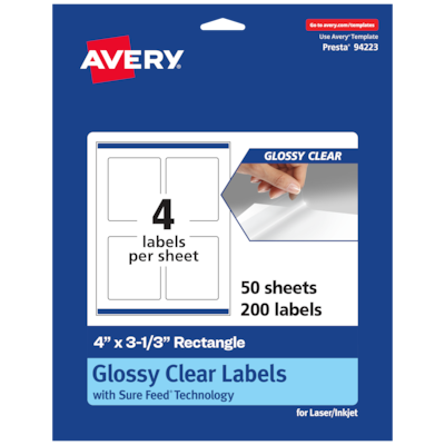 Create mailing labels, product labels, labels for food containers, soap labels, candle jar labels, body scrub labels that are absolutely clear with Avery 4" x 3-1/3" Glossy Clear rectangle Labels. Clear as glass with a reflective shine, Avery glossy clear labels vanish when applied to glass and metal surfaces. The transparent and glossy label material is also perfect for making the colors in your design pop and look even more vibrant on lighter surfaces. Avery rectangle labels are carefully constructed and developed with patented features to provide the best results for every project. Sure Feed technology prevents jams or smudges by creating a more reliable feed through your printer. The print-to-the-edge layout lets you print beautiful full-bleed designs that fill each blank sticker to the edge. The patented Easy Peel label design makes these labels easy to peel and quick to apply. Just bend the label sheet, peel off your labels and fold the sheet back flat. The strong permanent label adhesive makes sure that your labels stick and stay to a variety of surfaces without peeling, curling or falling off. Easily customize labels with your own designs, art, symbols and messaging by using the label templates and designs on the Avery website. The intuitive tools make it easy to add your personal touch to any project.
