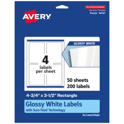 Add a beautiful shine to decorative shipping labels, labels for storage bins, product labels, labels for food containers, large bottle labels and more with Avery 4.75" x 3.5" Glossy White Rectangle Labels. The glossy finish gives labels a remarkable shine and helps give the colors of your design a little extra pop. Avery rectangle labels are carefully constructed with patented features to provide the best results. Sure Feed technology reduces jams or smudges by creating a more reliable feed through your printer. The print-to-the-edge layout lets you print beautiful full-bleed designs that fill each blank sticker to the edge. The strong permanent label adhesive makes sure that your labels stick and stay to a variety of surfaces without peeling, curling or falling off. Easily customize labels with your own designs, art, symbols and messaging by using the label templates and designs on the Avery website.