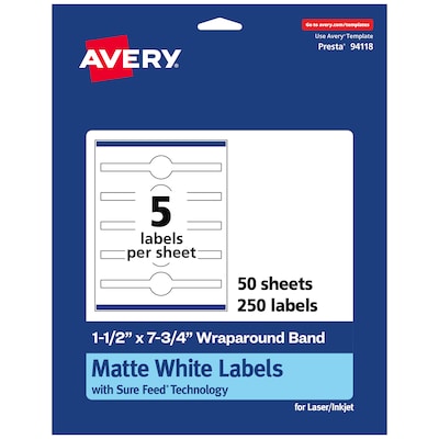 Whether you need a few sheets for yourself or hundreds for an event, it's easy to create your own unique soap labels, cosmetic product labels, jar labels, product seals, bottle labels and more with Avery 1-1/2" x 7-3/4" Matte White Wraparound Band Labels. Avery wraparound band labels are carefully constructed with patented features to provide the best results. Sure Feed technology prevents jams or smudges by creating a more reliable feed through your printer. The print-to-the-edge layout lets you print beautiful full-bleed designs that fill each blank sticker to the edge. These white wraparound band labels are compatible with both laser and inkjet printers so that you can effortlessly print bold, bright colors and clear, sharp text. The sturdy permanent label adhesive makes sure that your labels stick and stay to a variety of surfaces without peeling, curling or falling off. Easily customize labels with your own designs, art, symbols and messaging by using the free label templates and designs in Avery Design & Print. Avery Design & Print features a vast array of intuitive tools to help you import images, autofill labels with mail merge, format text in various shapes and much more.