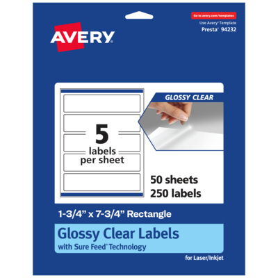 Create mailing labels, product labels, labels for food containers, soap labels, candle jar labels, body scrub labels that are absolutely clear with Avery 1.75" x 7.75" Glossy Clear rectangle Labels. Clear as glass with a reflective shine, Avery glossy clear labels vanish when applied to glass and metal surfaces. The transparent and glossy label material is also perfect for making the colors in your design pop and look even more vibrant on lighter surfaces. Avery rectangle labels are carefully constructed and developed with patented features to provide the best results for every project. Sure Feed technology prevents jams or smudges by creating a more reliable feed through your printer. The print-to-the-edge layout lets you print beautiful full-bleed designs that fill each blank sticker to the edge. The strong permanent label adhesive makes sure that your labels stick and stay to a variety of surfaces without peeling, curling or falling off. Easily customize labels with your own designs, art, symbols and messaging by using the label templates and designs on the Avery website. The intuitive tools make it easy to add your personal touch to any project.