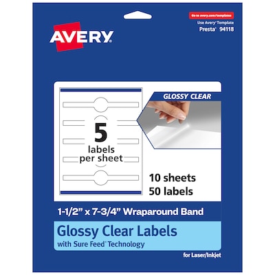 Create soap labels, cosmetic product labels, jar labels, product seals, bottle labels that are absolutely clear with Avery 1.5" x 7.75" Glossy Clear Wraparound Band Labels. Clear as glass with a reflective shine, Avery glossy clear labels vanish when applied to glass and metal surfaces. The transparent and glossy label material is also perfect for making the colors in your design pop and look even more vibrant on lighter surfaces. Avery Wraparound Band Labels are carefully constructed and developed with patented features to provide the best results for every project. Sure Feed technology prevents jams or smudges by creating a more reliable feed through your printer. The print-to-the-edge layout lets you print beautiful full-bleed designs that fill each blank sticker to the edge. The strong permanent label adhesive makes sure that your labels stick and stay to a variety of surfaces without peeling, curling or falling off. Easily customize labels with your own designs, art, symbols and messaging by using the label templates and designs on the Avery website. The intuitive tools make it easy to add your personal touch to any project.