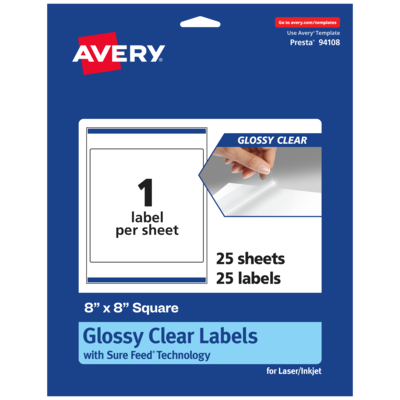 Avery Laser/Inkjet Multipurpose Labels, 8" x 8", Glossy Clear, 25/Pack (94108)