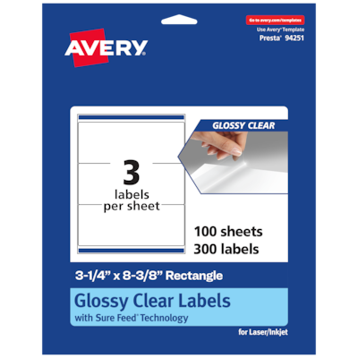Create mailing labels, product labels, labels for food containers, soap labels, candle jar labels, tamper-evident seals that are absolutely clear with Avery 3-1/4" x 8-3/8" Glossy Clear rectangle Labels. Clear as glass with a reflective shine, Avery glossy clear labels vanish when applied to glass and metal surfaces. The transparent and glossy label material is also perfect for making the colors in your design pop and look even more vibrant on lighter surfaces. Avery rectangle labels are carefully constructed and developed with patented features to provide the best results for every project. Sure Feed technology prevents jams or smudges by creating a more reliable feed through your printer. The strong permanent label adhesive makes sure that your labels stick and stay to a variety of surfaces without peeling, curling or falling off. Easily customize labels with your own designs, art, symbols and messaging by using the label templates and designs on the Avery website. The intuitive tools make it easy to add your personal touch to any project.
