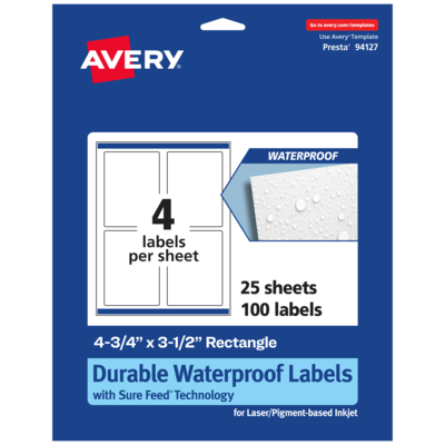 Personalize bottle labels, candle labels, jar labels and more with Avery 4.75" x 3.5" Durable Waterproof Rectangle Film Labels. Designed to withstand harsh conditions, Avery durable waterproof labels can be completely submerged in water without falling apart. They are also resistant to damage from heat, cold, oil and tearing and are also safe to wipe with household cleaners. Avery rectangle labels are carefully constructed with patented features to provide the best results. Sure Feed technology reduces jams or smudges by creating a more reliable feed through your printer. The print-to-the-edge layout lets you print beautiful full-bleed designs that fill each blank sticker to the edge. The strong permanent label adhesive makes sure that your labels stick and stay to a variety of surfaces without peeling, curling or falling off. Easily customize labels with your own designs, art, symbols and messaging by using the label templates and designs on the Avery website. *Please Note: Avery durable waterproof labels are compatible with laser printers and pigment-based inkjet printers but are not compatible with traditional dye-based inkjet printers. Ink from dye-based inkjet printers will smear when exposed to water. Please check your printer's manual to confirm if you are using pigment-based ink.