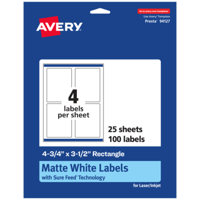 Avery Laser/Inkjet Multipurpose Labels, White, 4 Labels/Sheet, 25 Sheets/Pack (94127)