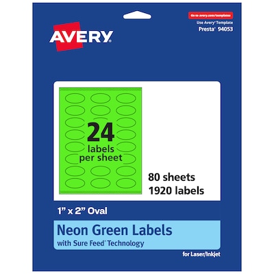 Avery Laser/Inkjet Multipurpose Oval Labels, 1" x 2", Neon Green, 1920/Box (94053)