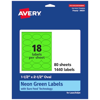 Avery Laser/Inkjet Multipurpose Oval Labels, 1.5" x 2.5", Neon Green, 1440/Box (94051)