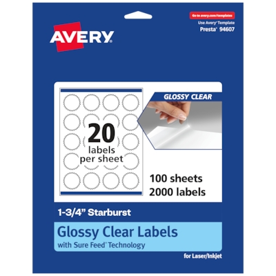 Order Avery Laser/Inkjet Multipurpose StarburstLabels, 1.75" Dia, Glossy Clear, 2000/Box (94607) today at Quill.com and get fast shipping. Stack coupons to get free gifts & extra discounts!
