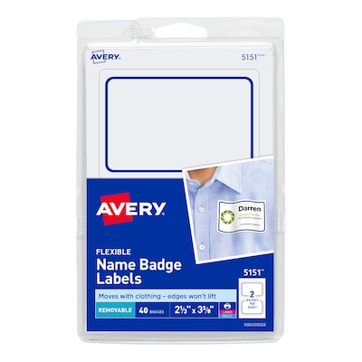 These Flexible Self-Adhesive Name Badges move with clothing and stick securely to fabric without the edges curling up or the badge falling off. The name tags feature our unique Peel-Away design that lets you easily separate the printed badge from the label sheet while the backing on each individual badge stays intact until ready to use. The removable adhesive is safe for most fabrics* but not recommended for use on delicate materials. Easily import contact information and customize your badges with personal titles, company names, logos and more using the free templates and designs at avery.com/print. *Not recommended for use on corduroy, plastic, leather, silk, suede, velvet, vinyl or other delicate fabrics