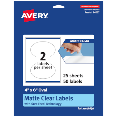 Create frosted clear product labels, candle labels, food & beverage labels, jar labels, mailing labels, wedding and party favor labels, and more with Avery 4" x 6" Matte Clear Oval Labels. The soft, translucent material of Avery Clear Labels is perfect for creating clear labels that blend seamlessly into lighter-colored objects and surfaces. The slightly frosted appearance also helps provide contrast to make sure your print stays legible. Avery oval labels are carefully constructed with patented features to provide the best results. Sure Feed technology reduces jams and smudges by creating a more reliable feed through your printer. The print-to-the-edge layout lets you print beautiful full-bleed designs that fill each blank sticker to the edge. The strong permanent label adhesive makes sure that your labels stick and stay to a variety of surfaces without peeling, curling or falling off. Easily customize labels with your own designs, art, symbols, and messaging by using the label templates and designs on the Avery website.