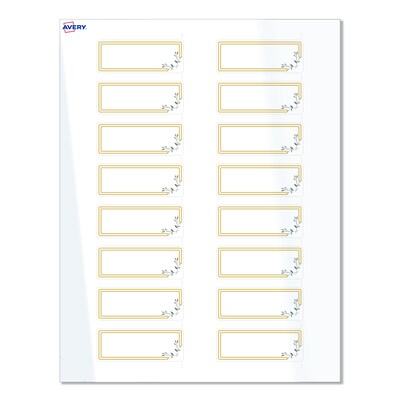 Pre-printed with beautiful designs, Avery Rectangle 1" x 2-5/8" Glossy White Labels with the Double Gold Border with Florals Design help save ink and also elevate your branding and events. Pre-designed and printed with metallic gold ink with high-quality printers, these shiny patterns will definitely stand out and are not easily achieved with desktop printers. These pre-printed embellishments also help save your printer ink so that you only need to print your customizable information. Mix and match these labels with other Avery products from the same collection that have the same pre-printed design to create a cohesive look. Featuring the helpful Pop-Up Edge technology to help lift and peel labels quickly, these permanent-adhesive labels are great for product labels, care instructions labels, ingredient labels, and more. Made with a glossy white material, the reflective finish adds a professional, photo-quality look to any project. Compatible with both laser and inkjet printers, these labels make it a breeze to personalize them with your own information with a desktop printer while still looking professional. Sure Feed technology reduces printer jams by creating a more reliable feed through your printer. Customize gold wedding labels, luxury holiday event labels, premium event labels, and festive gold labels with your own logos, text, and designs by searching for the Presta ID S00-D2K and using Avery Design & Print on the Avery site. Whether you’re a business owner that wants to add more flair to products, an event planner looking to elevate an event, or a teacher looking to step up class projects, Avery labels make it easy to translate your designs into reality.