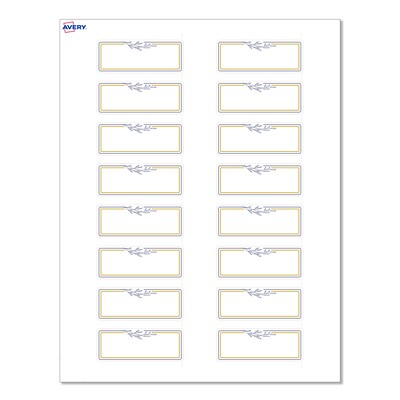 Pre-printed with beautiful designs, Avery Rectangle 1" x 2-5/8" Matte White Labels with the Gold & Navy Border with Florals Design help save ink and also elevate your branding and events. Pre-designed and printed with metallic gold ink with high-quality printers, these shiny patterns will definitely stand out and are not easily achieved with desktop printers. These pre-printed embellishments also help save your printer ink so that you only need to print your customizable information. Mix and match these labels with other Avery products from the same collection that have the same pre-printed design to create a cohesive look. Featuring the helpful Pop-Up Edge technology to help lift and peel labels quickly, these permanent-adhesive labels are great for product labels, care instructions labels, ingredient labels, and more. The versatile matte white material is a great solution for any project. Compatible with both laser and inkjet printers, these labels make it a breeze to personalize them with your own information with a desktop printer while still looking professional. Sure Feed technology reduces printer jams by creating a more reliable feed through your printer. Customize gold wedding labels, luxury holiday event labels, premium event labels, and festive gold labels with your own logos, text, and designs by searching for the Presta ID S00-D2X and using Avery Design & Print on the Avery site. Whether you’re a business owner that wants to add more flair to products, an event planner looking to elevate an event, or a teacher looking to step up class projects, Avery labels make it easy to translate your designs into reality.