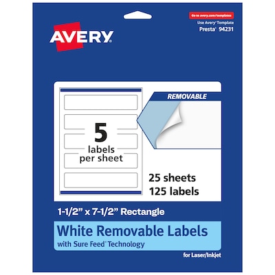 Add an elegant touch to home organization labels, price labels, product labels, labels for food containers, soap labels, candle jar labels, body scrub labels and more with Avery 1.5" x 7.5" Matte White Removable Rectangle Labels. Made with matte white paper and removable adhesive, the removable Avery labels stick and stay but remove cleanly. Apply these removable white labels to smooth surfaces such as paper, plastic, cardboard, glass, or metal and peel them away without leaving behind messy residue. Avery rectangle labels are carefully constructed with patented features to provide the best results. Sure Feed technology reduces jams or smudges by creating a more reliable feed through your printer. The print-to-the-edge layout lets you print beautiful full-bleed designs that fill each blank sticker to the edge. The dual-compatible printable labels are compatible with both laser printers and inkjet printers. Easily customize labels with your own designs, art, symbols, and messaging in Avery Design & Print. Whether you’re looking for labels to help organize your home, labels for a school project or product labels that will grab people’s attention, Avery Matte White Removable Labels are the perfect choice for any project.
