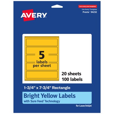 Avery Laser/Inkjet Rectangle Multipurpose Labels, 1.75" x 7.75", Bright Yellow, 100/Pack (94232)