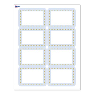 Pre-printed with beautiful designs, Avery Rectangle 2-1/3" x 3-3/8" Matte White Name Tags with the Blue Border with Gold Dots Design help save ink and also elevate your branding and events. Pre-designed and printed with metallic gold ink with high-quality printers, these shiny patterns will definitely stand out and are not easily achieved with desktop printers. These pre-printed embellishments also help save your printer ink so that you only need to print your customizable information. Mix and match these name tags with other Avery products from the same collection that have the same pre-printed design to create a cohesive look. Designed to stick securely and move with fabric without curling, these film name badges peel away cleanly and are great for name tag stickers, product labels, favor card labels, and more. The versatile matte white material is a great solution for any project. Compatible with both laser and inkjet printers, these name tags make it a breeze to personalize them with your own information with a desktop printer while still looking professional. Customize gold wedding name tags, luxury holiday event name tags, premium event name tags, and festive gold name tags with your own logos, text, and designs by searching for the Presta(R) Template S00-EY7 and using Avery Design & Print on the Avery site. Whether you’re a business owner that wants to add more flair to products, an event planner looking to elevate an event, or a teacher looking to step up class projects, Avery name tags make it easy to translate your designs into reality.