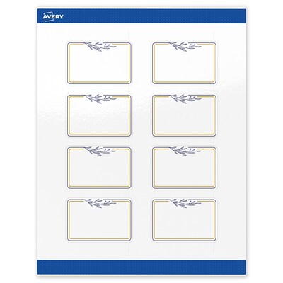 Save ink and time with Avery products with pre-printed designs. Pre-printed with beautiful designs, Avery Rectangle 2" x 3" Glossy White Labels with the Gold & Navy Border with Florals design help save ink and also elevate your branding and events. Pre-designed and printed with shiny matte gold ink with high-quality printers, these patterns will definitely stand out and are not easily achieved with desktop printers. Mix and match these labels with other Avery cards, tags, and name badges from the same collection that have the same pre-printed design to create a cohesive look. Featuring the helpful Pop-Up Edge technology to help lift and peel labels quickly, these permanent-adhesive labels are great for food labels for containers, logo labels, product labels, and more. Made with a glossy white material, the reflective finish adds a professional, photo-quality look to any project. Compatible with both laser and inkjet printers, these labels make it a breeze to personalize them with your own information with a desktop printer while still looking professional. Avery premium labels are carefully constructed with beneficial features to provide the best results and allow your brand to stand out. Sure Feed technology reduces printer jams by creating a more reliable feed through your printer. Easily customize gold wedding labels, luxury holiday event labels, premium event labels, festive gold labels, and more with your own logos, text, and designs by searching for the Presta ID S00-DNE and using the templates and tools in Avery Design & Print on the Avery site. Whether you’re a business owner that wants to add more flair to products, an event planner looking to elevate an event, or a teacher looking to step up class projects, Avery labels make it easy to translate your designs into reality.