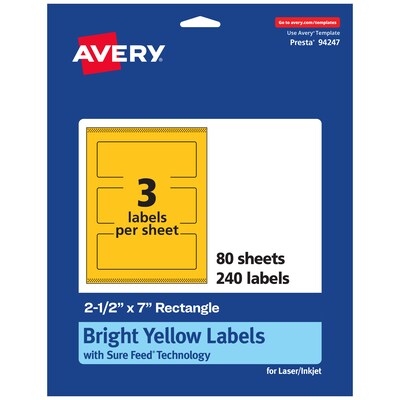 Avery Laser/Inkjet Rectangle Multipurpose Labels, 2.5" x 7", Bright Yellow, 240/Box (94247)