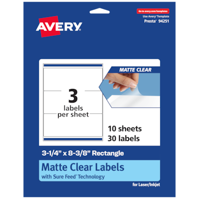 Avery Laser/Inkjet Rectangle Multipurpose Labels, 3-1/4" x 8-3/8", Clear, 30/Pack (94251)